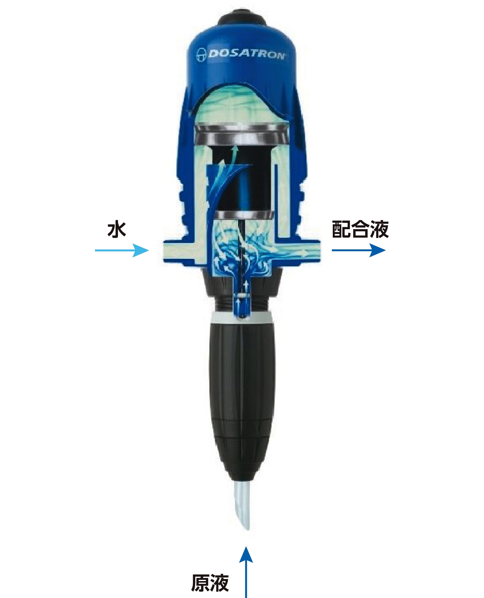 ドーサトロンは電気やエアーなどの動力源を必要とせずに、水道水の水圧だけで作動する比例混合装置です。薬液を一定の比率で自動的に混合し、配合量を連続的に排出。エジェクター方式と異なり、水圧や流量が変化しても一定の比率で正確に混合します。